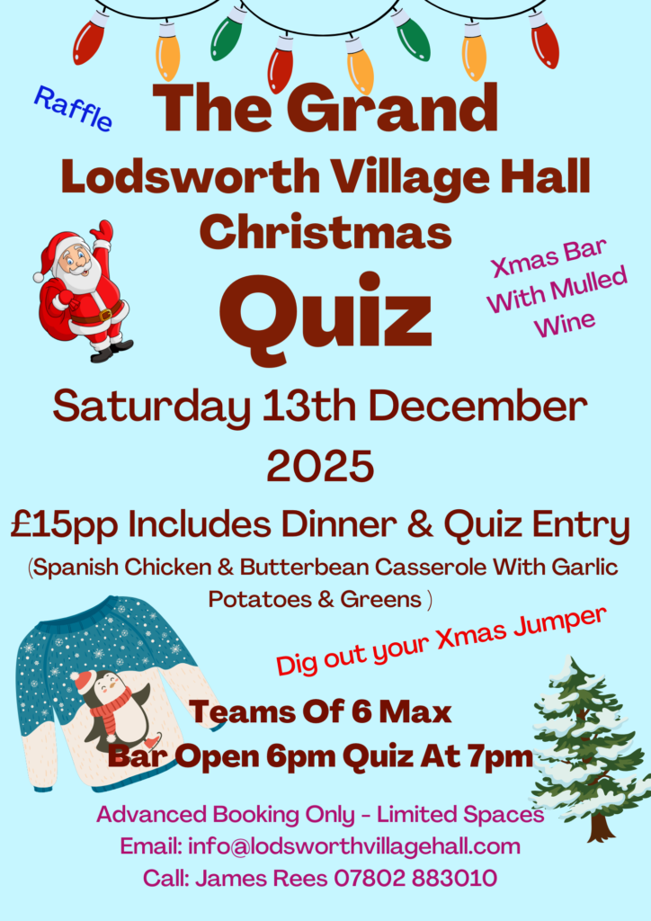 Its that time again – We return with our every popular Christmas Quiz – get your thinking caps on and join us for the Grand Lodsworth Village Hall Valentines Quiz. We will be serving Spanish Chicken Casserole, Garlic Roast Potatoes & Veg as our meal for the evening and a fully stocked bar and warm seasonal Mulled Wine & fizz to warm you up on the chilly evening. Doors open at 6.00pm for pre drinks, the quiz will be underway at 7.00pm